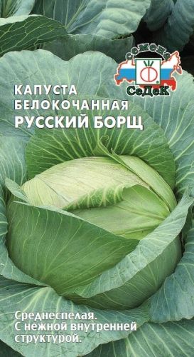 Сорт белокочанной капусты «Русский борщ» отличается высокой урожайностью и превосходными вкусовыми качествами. Среднеспелый, сформированный кочан округлой формы, плотный, весом от 3 до 4 кг. Листья сочные, зелёно-голубоватого оттенка, с нежным вкусом и тонким ароматом. Предназначен для свежего потребления, квашения и приготовления различных блюд. Выращивание возможно в различных климатических зонах. Семена отличаются хорошей всхожестью. Рекомендуется для профессионального и любительского огородничества.