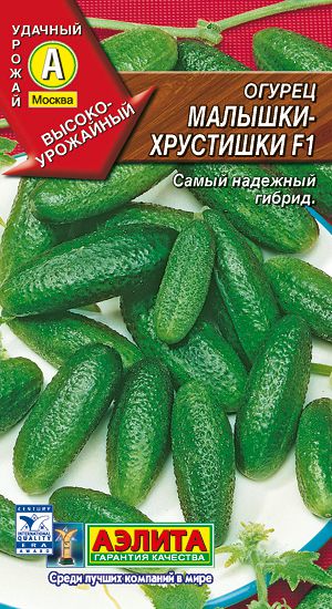 Гибрид F1 «Малышки-хрустишки» — раннеспелый, высокоурожайный партенокарпический сорт. Период от всходов до сбора урожая составляет 43-45 дней; Предназначен для культивирования в открытом грунте и под пленочными укрытиями; Растения среднеплетистые, с характерным пучковым образованием завязей, что обеспечивает высокую урожайность (15-16 кг/м.). Плоды цилиндрической формы, мелкобугорчатые, белошипые, генетически не склонны к горечи и не перерастают. Отличаются отменными вкусовыми качествами, идеально подходят для употребления в свежем виде, консервирования и маринования.