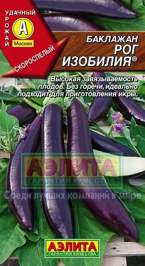 Сорт баклажана "Рог Изобилия" включен в Госреестр РФ (заявка № 54632, регистрация 2010-10-07, допуск 2011 г.). Относится к скороспелым сортам, предназначен для выращивания в открытом грунте и под пленочными укрытиями. Характеризуется высокой урожайностью и отменным качеством плодов, что и обусловило его название. Растение высокорослое, отличается устойчивостью к неблагоприятным погодным условиям и температурным колебаниям. Плоды обладают вытянутой цилиндрической формой, темно-фиолетовой окраской с глянцевым блеском. Мякоть плотная, нежная, белого цвета, без горечи, отличается приятным вкусом и удобна для нарезки.