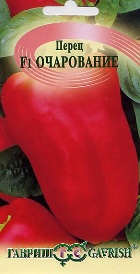Гибрид сладкого перца Очарование F1 характеризуется ранним сроком созревания (110-112 дней от полных всходов до технической спелости). Рекомендуется для культивирования в условиях защищенного грунта – пленочных и остекленных теплицах. Растение формирует штамбовый, полураскидистый куст высотой 70-80 см. Плоды обладают конусовидной формой, гладкой поверхностью и глянцевым блеском. В фазе технической спелости окраска плодов желтовато-зеленая, в биологической – красная. Средняя масса плода составляет 77-103 г, толщина стенки – 5,0-5,5 мм. Отмечаются хорошие вкусовые качества. Гибрид ценится за высокую урожайность и товарность продукции.