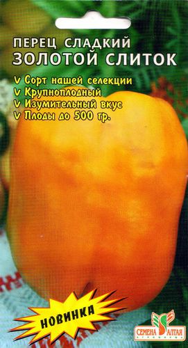 Сорт сладкого перца Золотой Слиток, выведенный селекционерами Агрофирмы «Семена Алтая», характеризуется раннеспелостью и высокой урожайностью. Растение характеризуется полураскидистой формой средней высоты. Плоды обладают кубовидной формой, глянцевой поверхностью и ярким желтым цветом. Средняя масса плодов составляет от 161 до 300 г, а толщина стенки – 7-9 мм. Отмечается высокая сочность и сладкий вкус плодов, что делает сорт идеальным для употребления в свежем виде, в салатах и различных кулинарных блюдах без дополнительной термической обработки. Сорт демонстрирует отличные вкусовые качества и привлекательный внешний вид, что делает его востребованным среди садоводов и огородников. Рекомендован для выращивания в открытом грунте и под пленочными укрытиями, особенно в условиях Западной Сибири.
