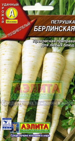Сорт петрушки Берлинская представляет собой корневую разновидность, отличающуюся позднеспелостью. Вегетационный период составляет от 90 до 180 дней. Данный сорт ценится за свои крупные, кремово-белые корнеплоды, достигающие длины до 30 см. Листья этого сорта имеют темно-зеленую окраску, гладкую поверхность и являются прямостоячими. Берлинская характеризуется высокой урожайностью и устойчивостью корнеплодов к растрескиванию, а также обладает хорошей лежкостью. Данный сорт пригоден для выращивания в открытом и защищенном грунте.
