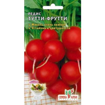 Редис Тутти-Фрутти является среднеранним сортом, характеризующимся дружным созреванием. Отличается устойчивостью к цветушности и формирует короткую листву. Корнеплоды имеют округло-овальную форму, темно-красную окраску и массу в диапазоне 12-15 грамм.