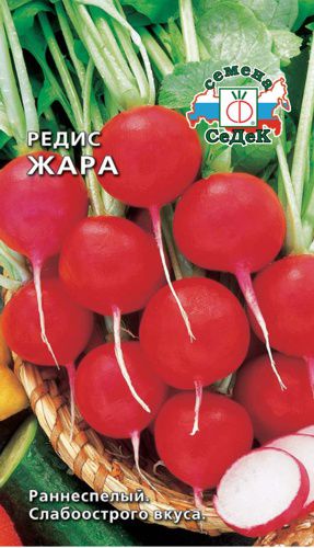 Редис Жара – раннеспелый сорт, выведенный на Витенской опытной станции им. Мичурина. Вегетационный период составляет 18-27 дней. Корнеплоды округлые или овальные, гладкие, диаметром 3-3,5 см, массой 13-27 г, красно-малинового цвета. Мякоть белая или бело-розовая, плотная, сочная, слабо-острого вкуса, без горечи. Отличается высокой урожайностью (1,5-2,3 кг/м.) и хорошими вкусовыми качествами. Содержит значительное количество витамина С. Подходит для выращивания в открытом грунте и под пленочными укрытиями. Используется в свежем виде, хорошо переносит транспортировку, но не предназначен для длительного хранения. Существует также разновидность Жара-2 с более крупными плодами.