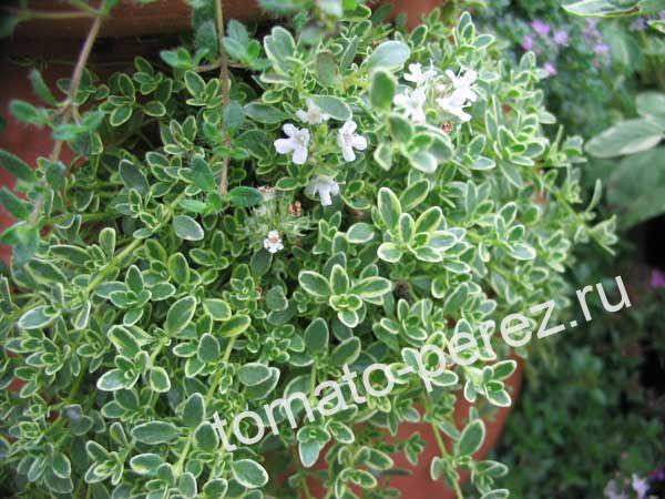 Многолетнее полукустарниковое растение до 35 см высотой. Листья мелкие, от округлой до линейно-продолговатой формы, жёсткие. Цветки белые, розовые или сиреневые, собраны в шаровидные соцветия. Все растение очень душистое и очень красивое. Молодые веточки используют в кулинарии как приправу к мясным, овощным и рыбным блюдам в свежем и сушеном виде. А в медицине - как средство для лечения заболеваний легких, нервной системы, желудочно-кишечного тракта. Почти все виды Тимьяна морозостойки и неприхотливы в выращивании. Подробнее о Тимьяне. Фото с сайта: www.coompax.com