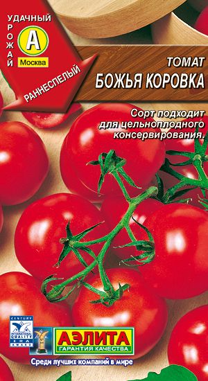 Томат "Божья коровка" – ультраскороспелый, детерминантный сорт, предназначенный для выращивания как в открытом грунте, так и под пленочными укрытиями. Отличается высокой урожайностью, достигающей 8-9 кг/м2. Компактные растения ампельного типа, с побегами длиной 25-40 см, не требуют сложного ухода. Плоды – небольшие, круглые, ярко-красные, массой 20-25 г, собраны в кисти. Сорт ценится за раннее созревание (75-80 дней от всходов), отличный сладкий вкус и устойчивость к болезням. Идеально подходит для употребления в свежем виде и консервирования.