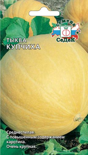 Тыква Купчиха – среднеспелый гибрид (110-115 дней вегетационного периода), характеризующийся мощным, длинноплетистым растением. Плоды обладают выравненной формой, окрашены в оранжево-желтый цвет; Средняя масса товарной тыквы составляет 8-10 кг, максимальная достигает 20-24 кг. Мякоть плотная, сочная, отличается ярко-оранжевой окраской и приятным вкусом, напоминающим дыню. Сорт включен в Госреестр по Центральному региону (код 9252180). Данные о химическом составе мякоти указывают на высокое содержание воды (70-94%), сахаров (около 31%), крахмала (около 22%) и пектиновых веществ (до 10%). Культура рекомендована для выращивания в условиях умеренного климата.